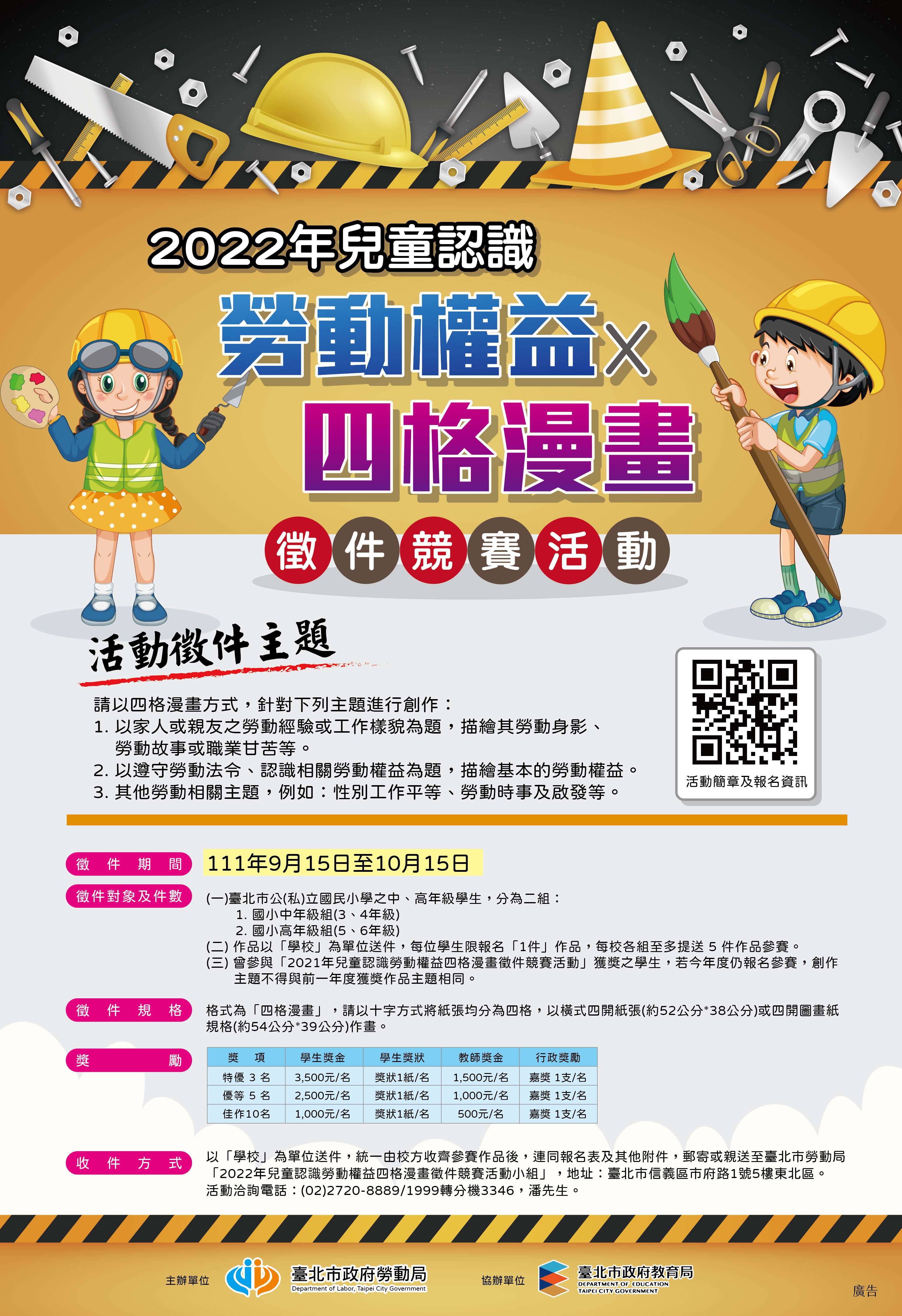 六、旨揭活動徵件內容及相關申請表單,請詳附件活動簡章, 或至本局官網(網址:https://bit.ly/35YbZWl)下載 (路徑:勞動局官網〉業務服務〉勞動教育文化〉勞動教 育〉兒童認識勞動權益四格漫畫徵件活動),相關疑問, 請洽活動專線:(02)2720- 8889/1999轉分機3346。