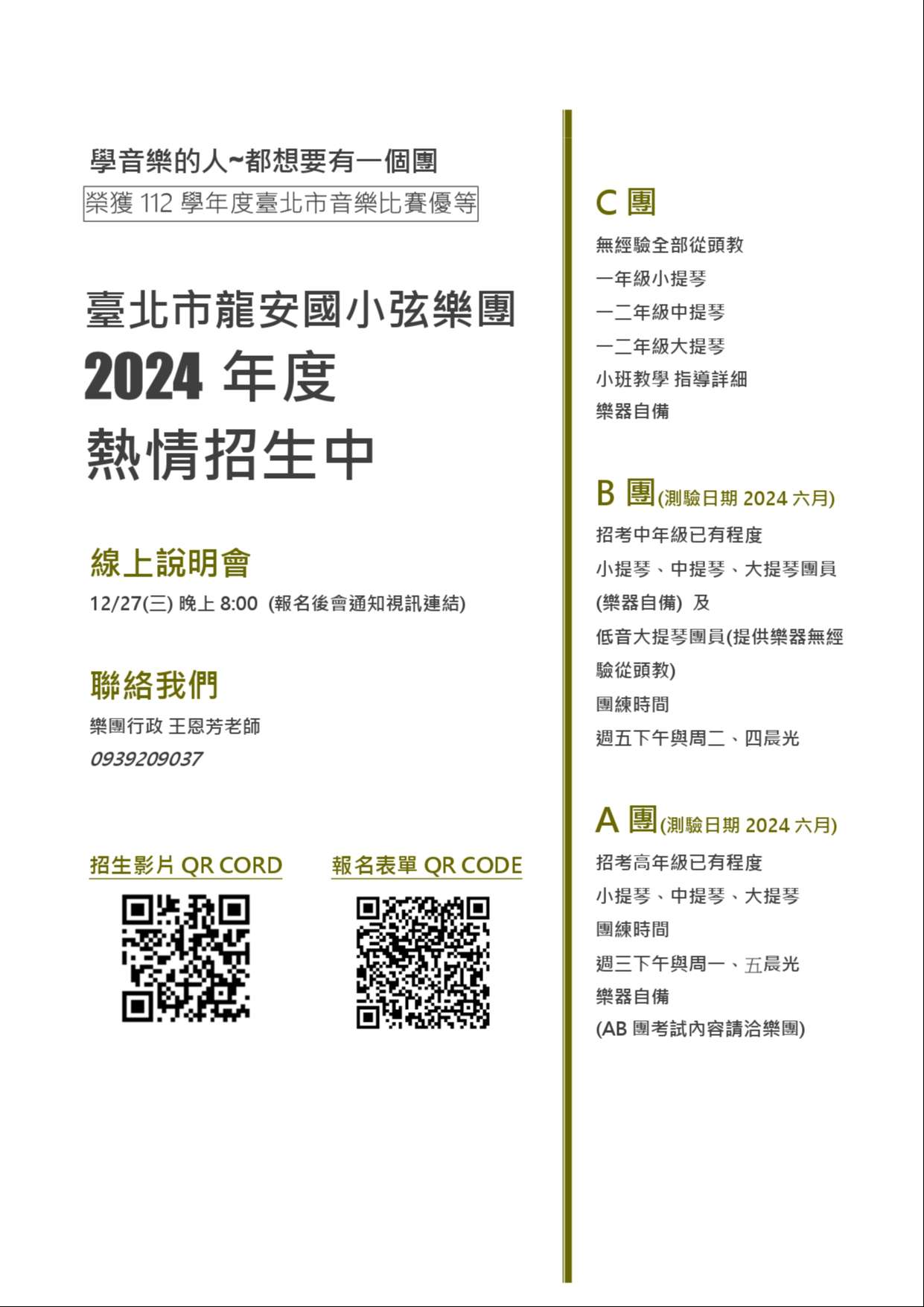 臺北市龍安國小弦樂團2024 年度熱情招生中