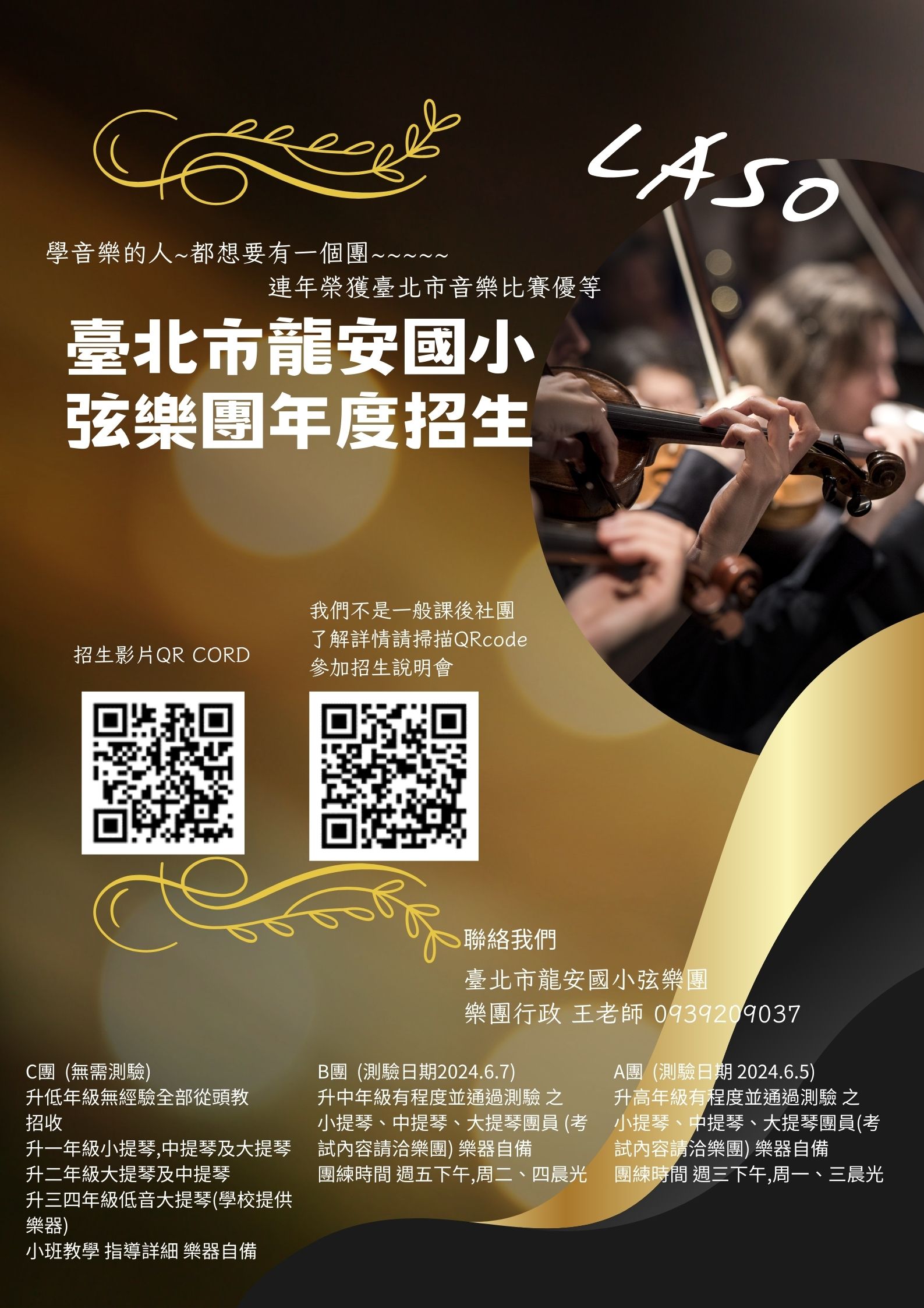 本校弦樂團為校隊屬性,專業菁英式培訓音樂演奏能力。除了招考中高年級弦樂程度適合的團員,也招收C 團低年級學生為種子團員從零開始教。報名時請留意可報考的年級與資格程度。