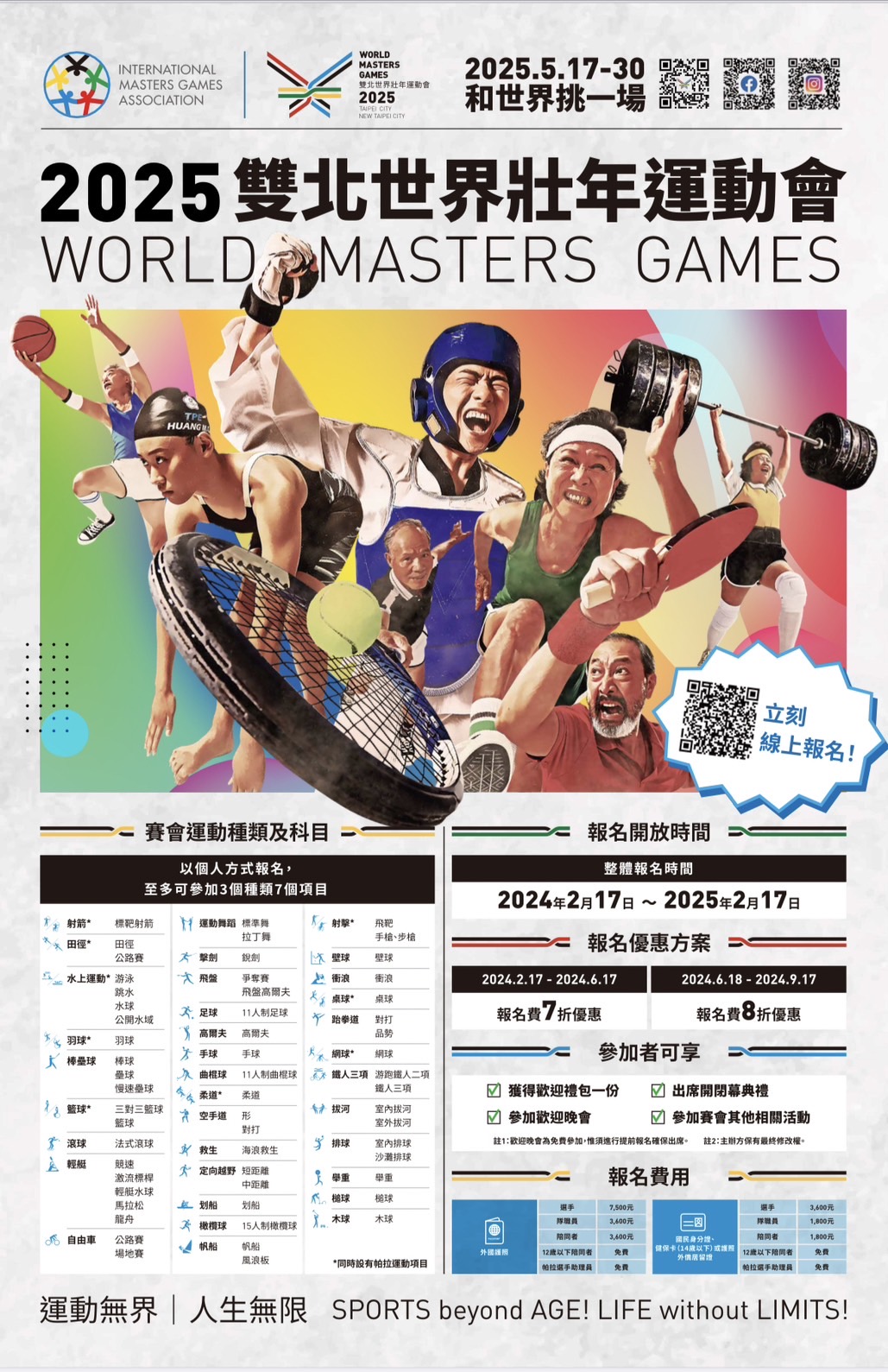一、世界壯年運動會(World Masters Games,下稱世壯運)每 4年舉行1次,為國際性大型體育賽事,2025年由本市及新 北市共同主辦,亦是亞洲首次辦理該項運動賽事之國家, 即將於114年5月17日盛大展開。