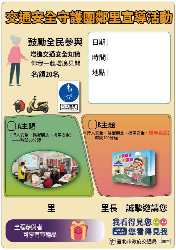 三、本專案講座可安排時段為即日起至115年6月30日止,每場約20人,宣講主題分為A主題(行人安全、路權觀念、機車安全)辦理時間50分鐘,以及B主題(行人安全、路權觀念、機車安全、機車桌遊)辦理時間100分鐘,請二擇一(詳附件)提出申請,申請單位需自備場地及授課相關設備(可投影布幕或電視、麥克風設備等),以一年內尚未申請宣講講座之單位優先辦理,近半年內未申請宣講講座之單位次之。