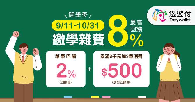 (二)活動內容:活動期間當月使用悠遊付每筆扣款享2%悠遊 付回饋金,另累積消費新臺幣(以下同)8,000元加3筆消費即回饋500元現金回饋券,活動期間每戶最高回饋8% 悠遊付回饋金(或回饋券)。