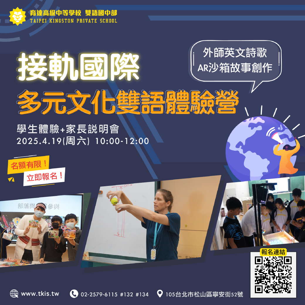 一、課程介紹:全球化的時代,雙語能力是孩子未來發展的重要 資產,本次Kingston雙語體驗營集結本校外師與中師,設 計一系列豐富有趣的體驗課程,讓學生能在半日的課程中 學習透過AR沙箱進行故事創作並了解原住民的遷移歷史;外 師透過英文詩歌,讓學生能接觸英語世界的文化、歷史與 情感表達,使學習更具趣味性與文化深度!我們也在同一時 間安排114學年入學說明會,深入介紹我們的課程規劃與環 境導覽,歡迎爸爸媽媽帶著您的孩子一同報名參加!