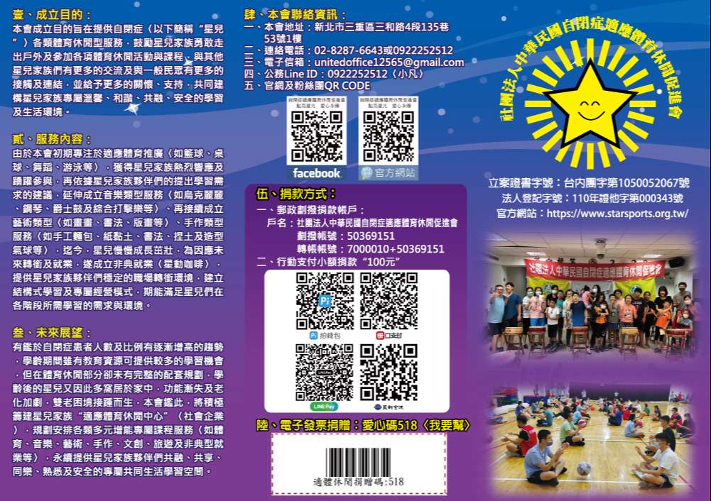 二、本會長期致力於自閉症者〈以下簡稱“星兒”〉各項體育〈籃球、桌球、水適能、舞蹈等〉及休閒〈藝術創作、音樂培養、手作工藝等〉等服務,期能提供星兒家庭專屬合適的學習環境,不斷成長〈簡介單張如附件一〉。