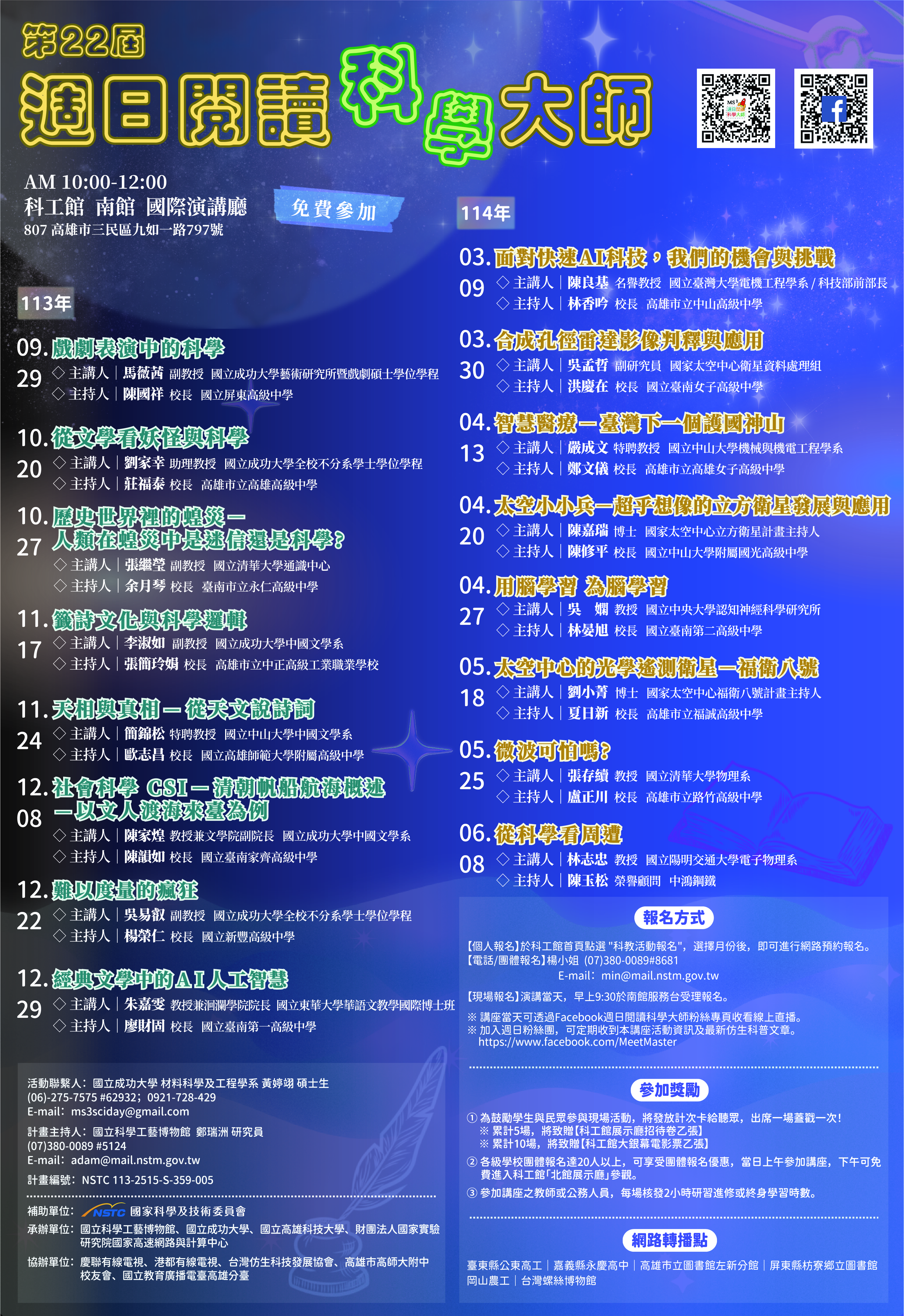 三、講座為免費入場,辦理地點為國立科學工藝博物館南館國際演講廳,每場講座核發參加教師2小時研習時數,參加公 務人員核予2小時進修時數;講座亦提供現場直播,歡迎透過週日閱讀科學大師官網:http://science.nchc.org.tw/web即時觀看。