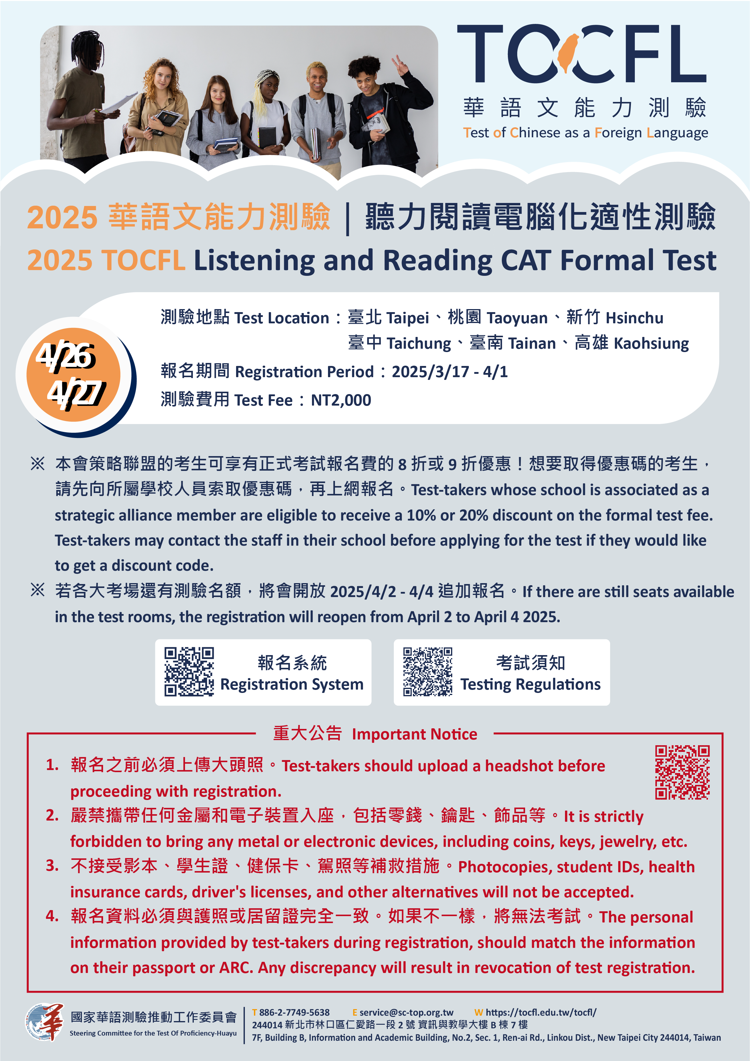 三、測驗日期:4月26至4月27日(星期六、星期日)聽讀測驗-電腦化適性測驗。