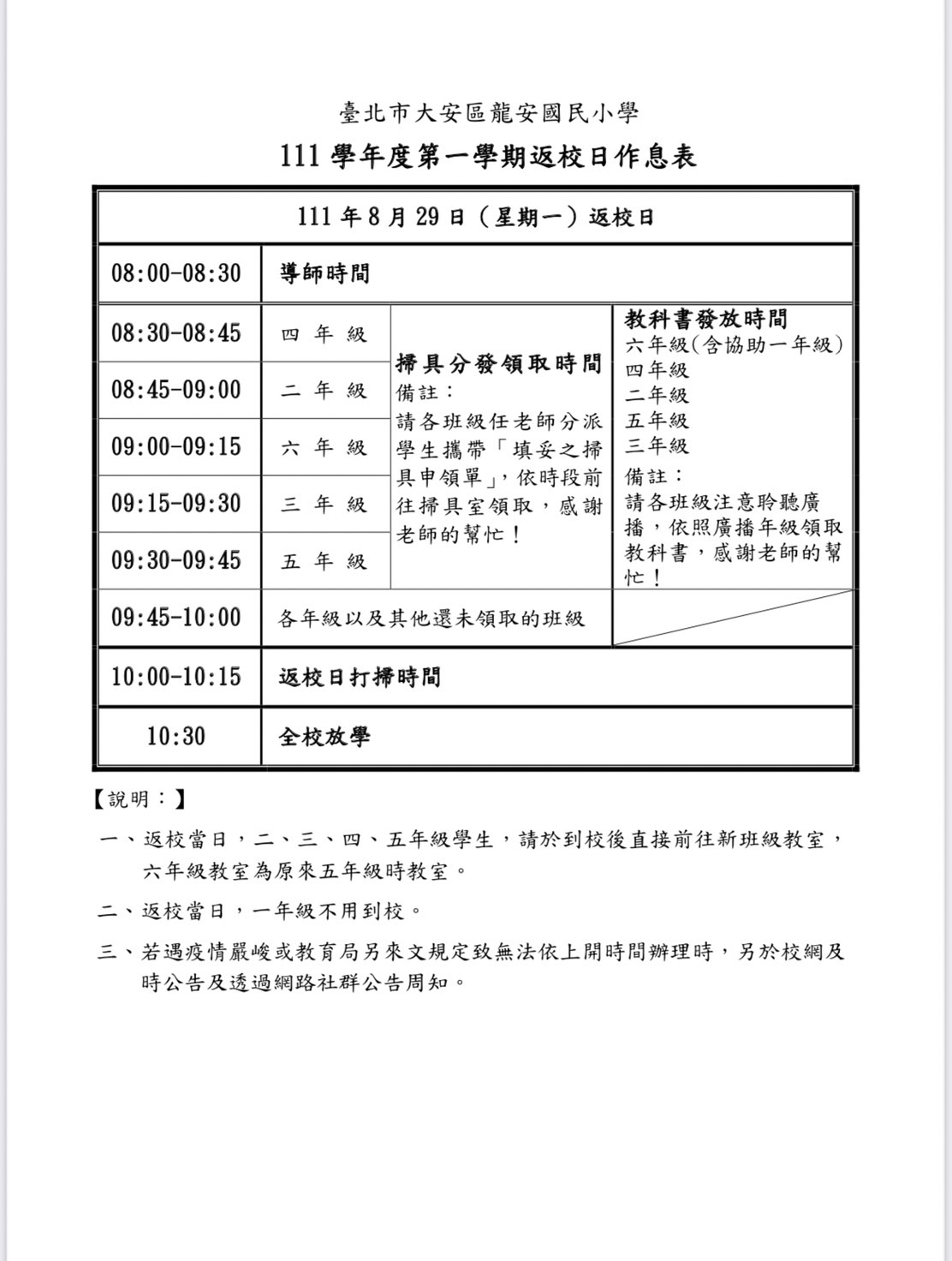 1.有關111年8月29日(星期一)返校日「111學年度第一學期返校日」作息時間,如附件,敬請參酌。 2.若遇疫情嚴峻或教育局另來文規定致無法依上開時間辦理時,另於校網及時公告及透過網路社群公告周知。