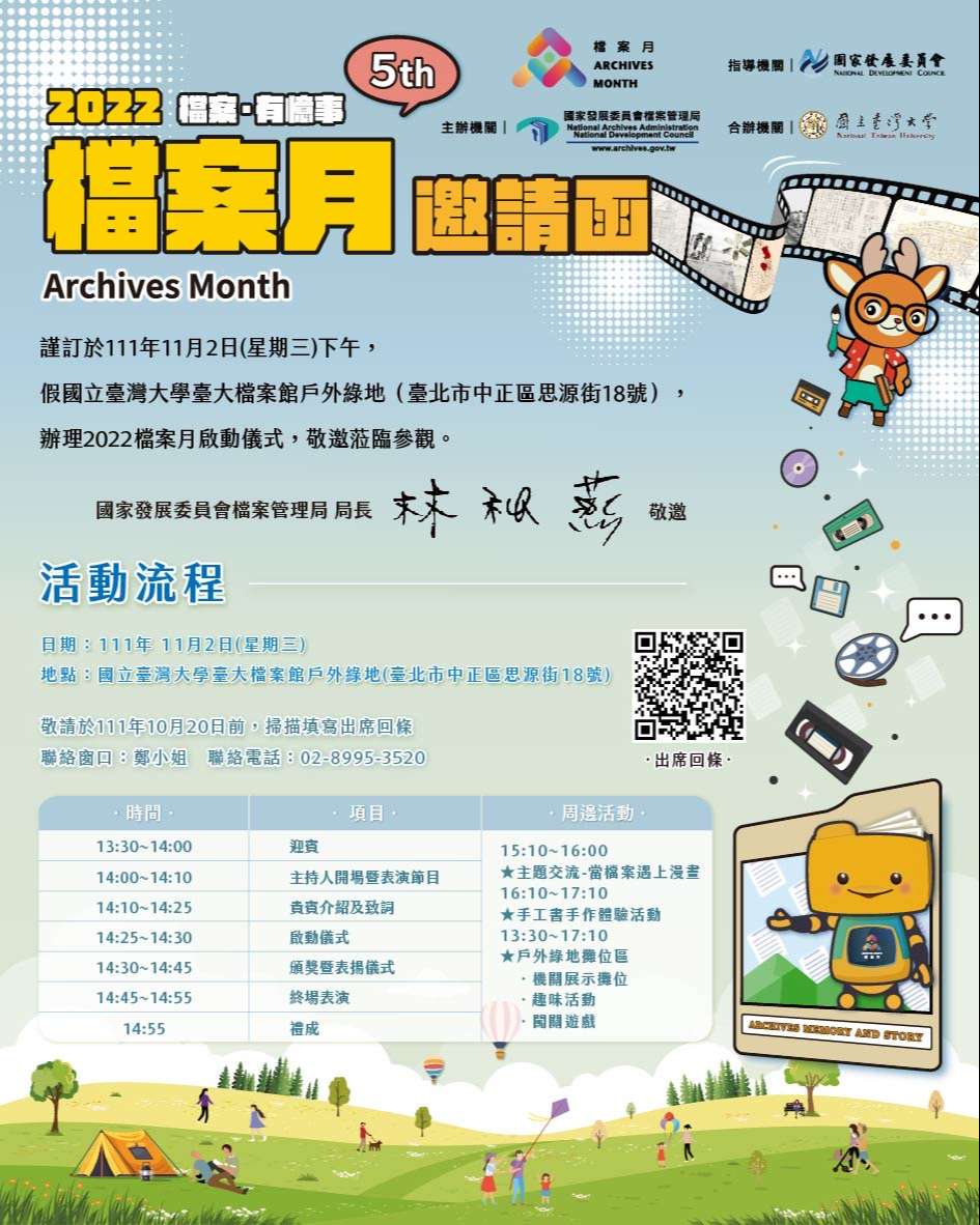 四、詳請參閱附件之2022檔案月啟動儀式暨周邊活動海報及電子請柬。