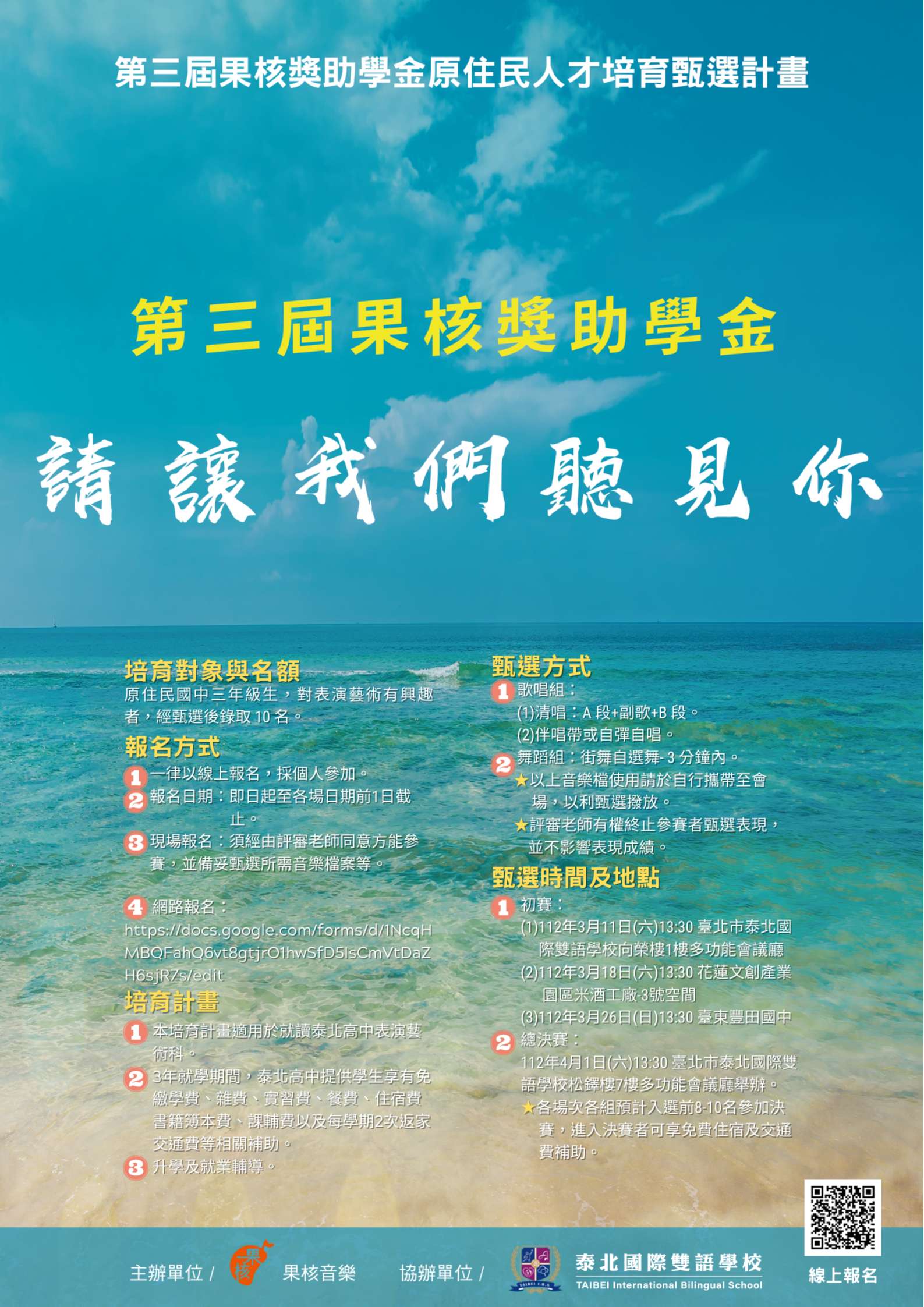 一、為培育原住民族群發展表演藝術潛能,本校與果核有限公司合作,以才藝甄選方式招收原住民學生,進行人才培育計畫。