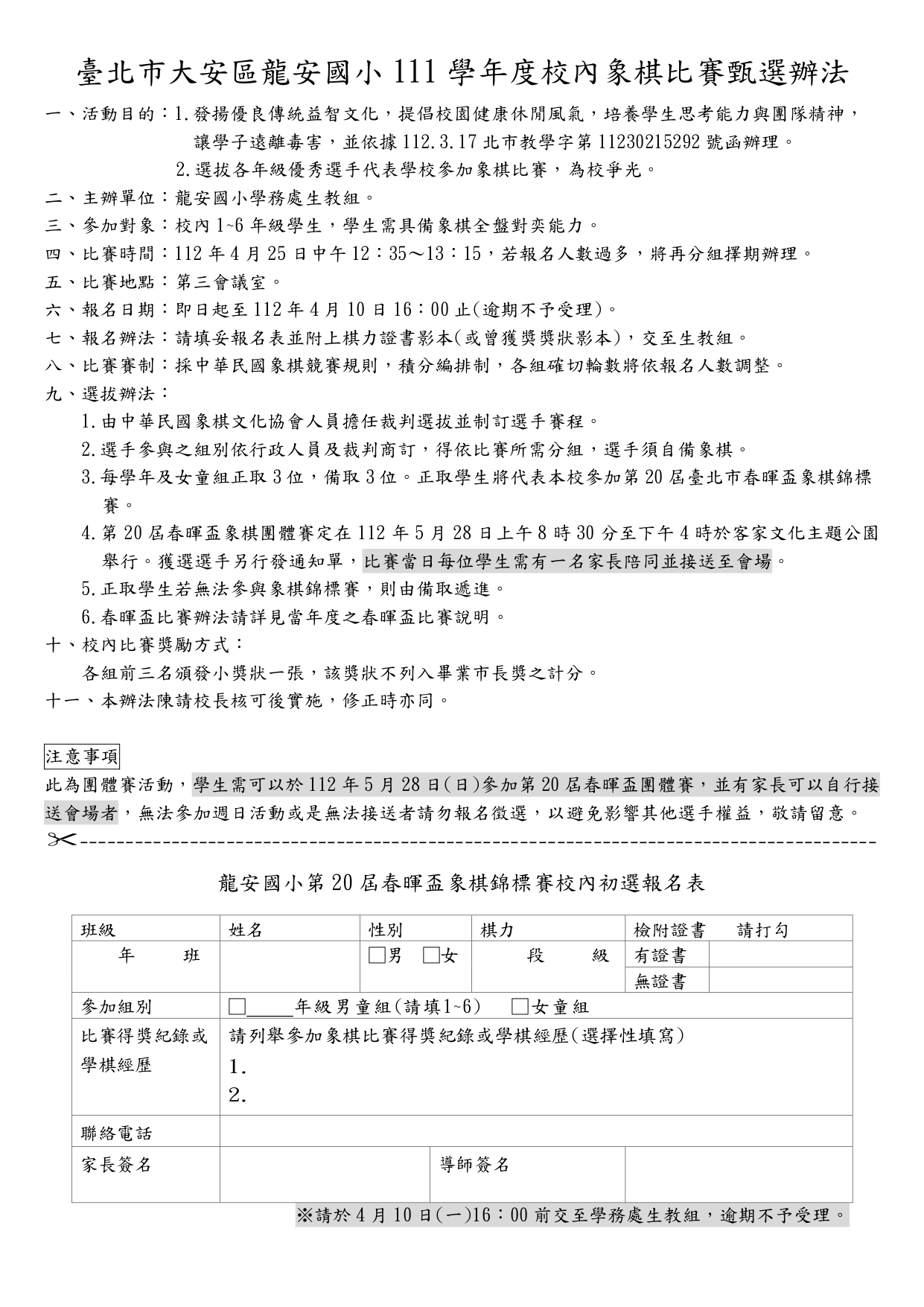 龍安國小 111 學年度校內象棋比賽甄選辦法