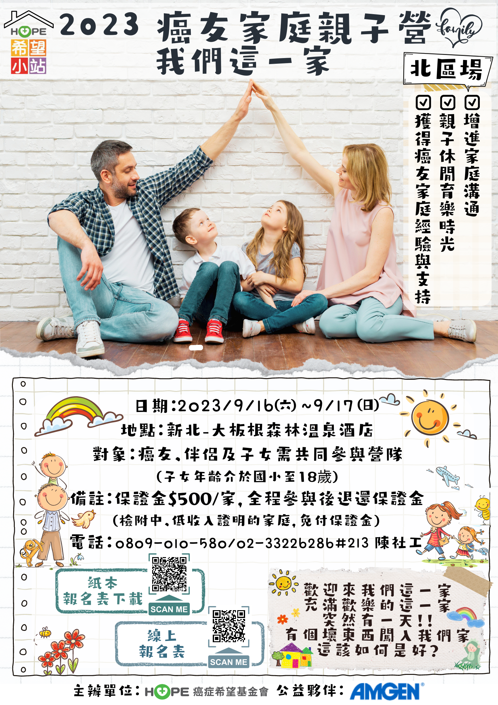 一、藉由親子營,協助罹癌父母理解孩子如何看待癌症,提供親子溝通癌症訊息的平台與管道,增進親子對話的機會。 透過團體引導及討論的方式,促進親子溝通及互動,讓彼此的「愛」得以在家庭中流動。 二、親子營報名時間即日起至112年8月18日止。報名簡章如附件,請公告週知。