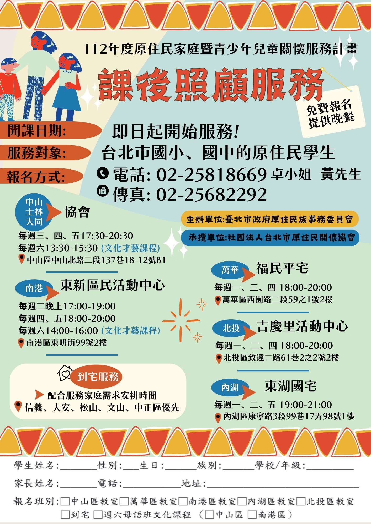 辦理「112年原住民家庭暨青少年兒童關懷服務計畫」課後照顧宣傳報名表,惠請協助發送或轉知所轄原住民家戶踴躍報名參加,請查照。