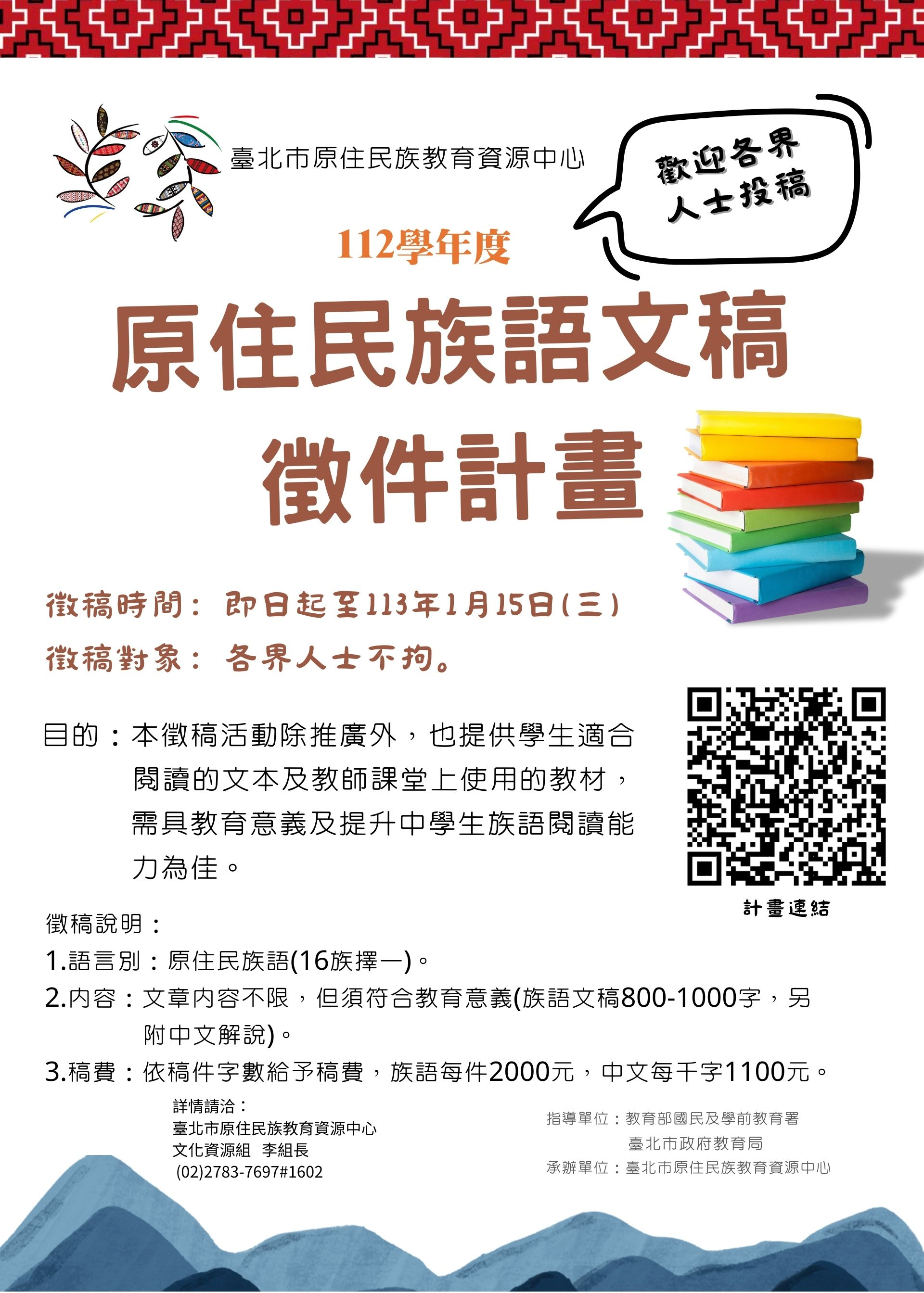 (四)徵稿說明: 1、語言別;原住民族語(16族擇一)。 2、內容:文章內容不限,但須符合教育意義(族語文稿800-1000字,另附中文解說)。