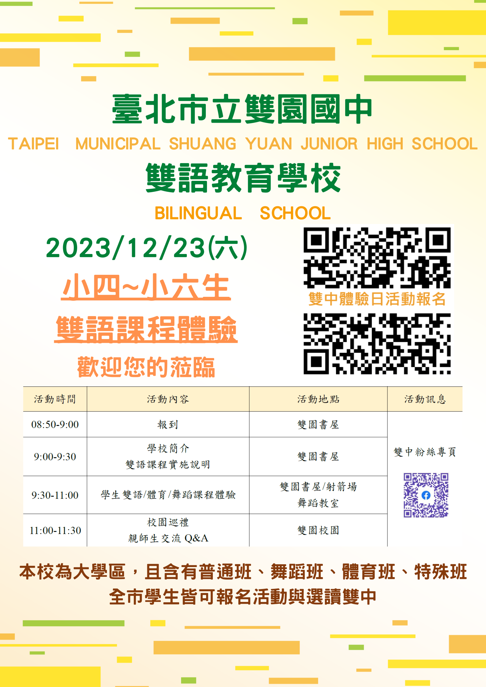 一、本校已核定自111學年度起實施雙語課程,期透過本校辦學 理念說明、學校簡介及課程體驗等活動,增進國小學生及 家長對本校的瞭解。
