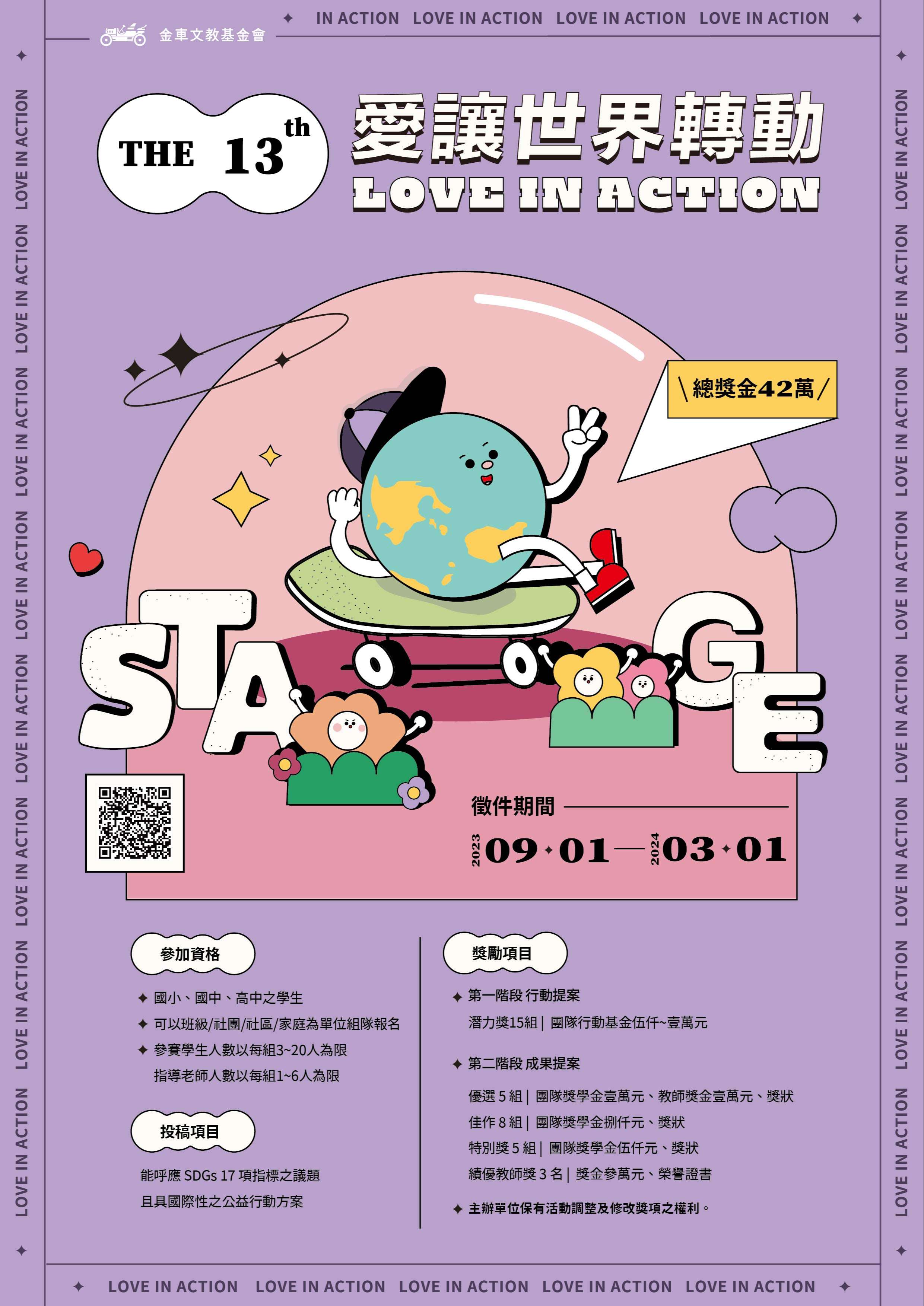 一、本會自2011年開始舉辦「愛讓世界轉動 兒少公益行動」徵 選,以STAGE行動步驟為基礎,從發現問題、創意思考、行動實踐到收穫反思,鼓勵青年學子以國際視野落實在地行 動,培育下個世代成為具備同理心、行動力及團隊溝通力之世界公民。