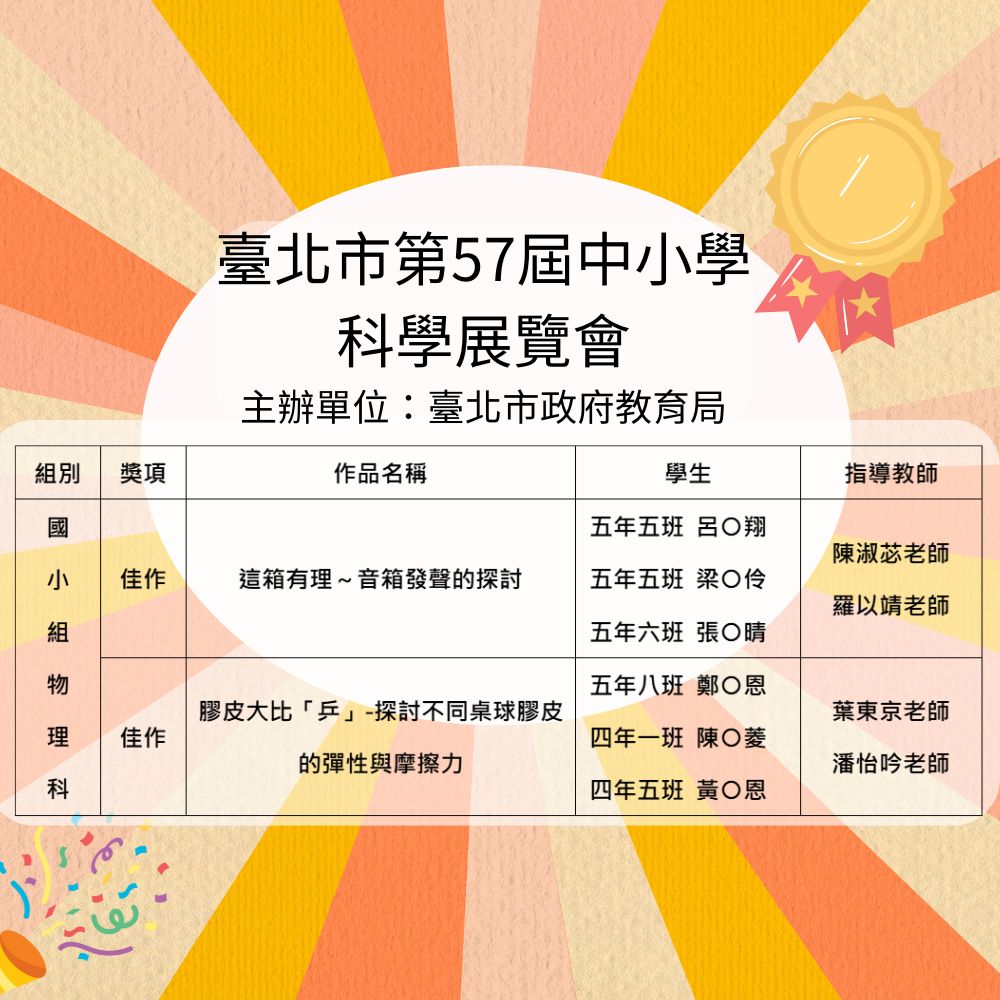 賀!本校參加臺北市政府教育局主辦臺北市第57屆中小學科學展覽會成績優異!榮獲兩項佳作!