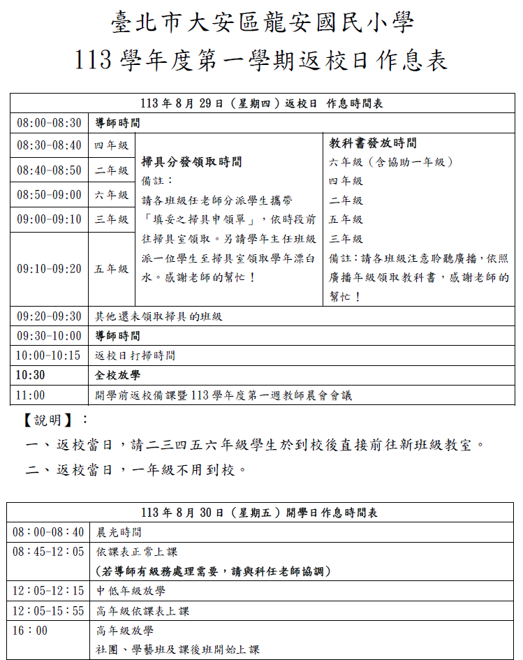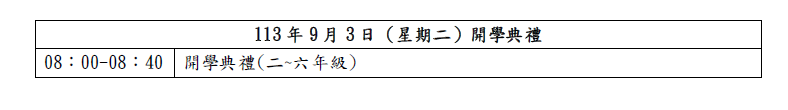 1.有關113年8月29日(星期四)返校日「113學年度第一學期返校日」作息時間,如附件,敬請參酌。