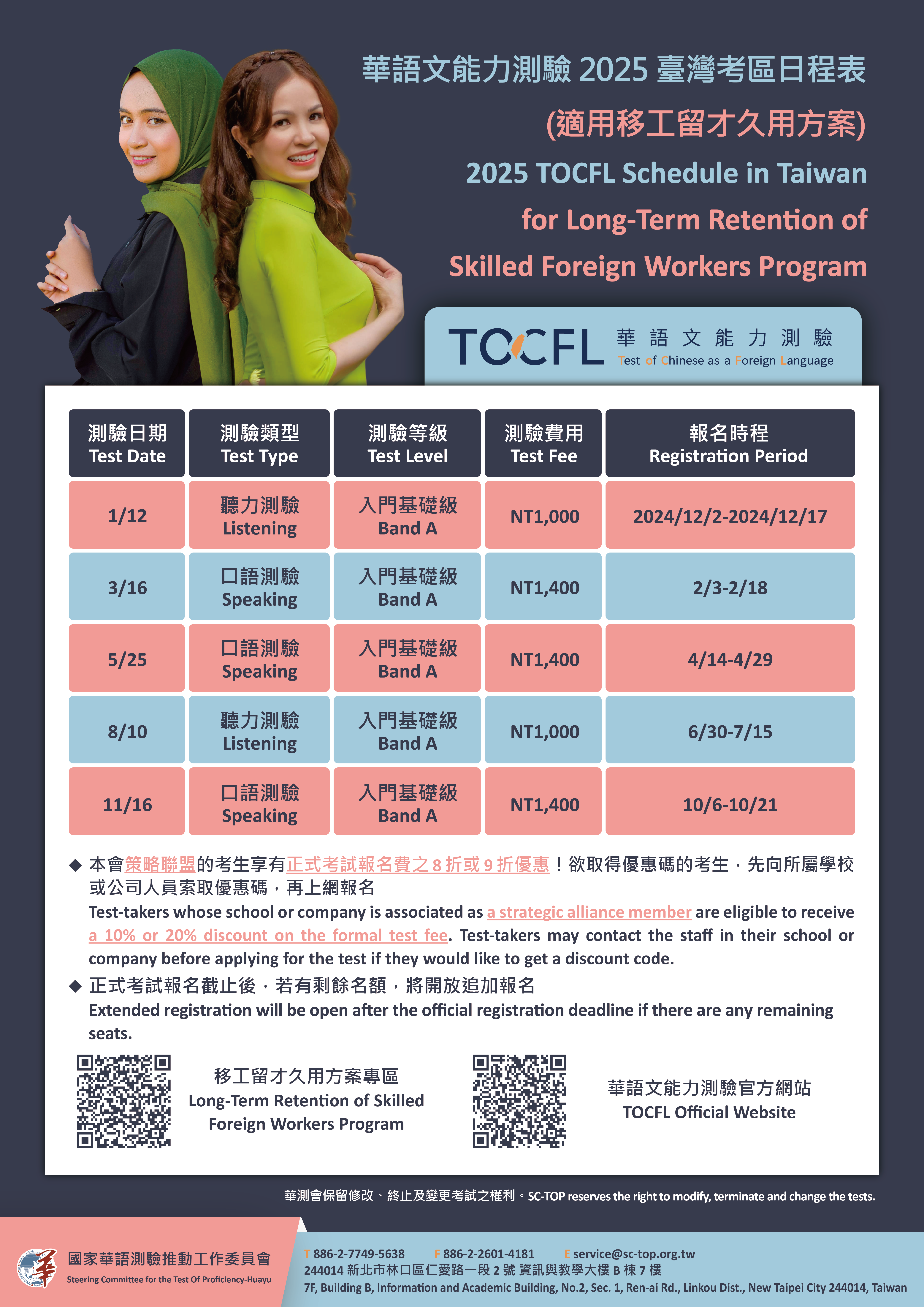(三)為配合勞動部移工留才久用方案,舉辦2次聽力測驗正式考試及3次口語測驗正式考試,皆於週日辦理。
