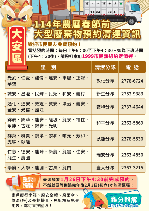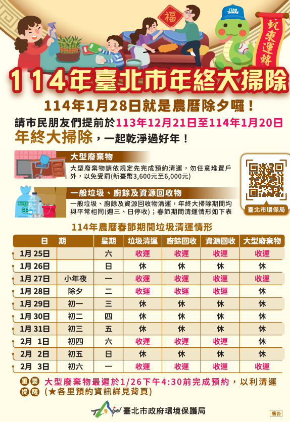114年1月28日就是農曆除夕囉!請市民朋友們提前於113年12月21日至114年1月20日進行「年終大掃除」,讓我們一起乾淨過好年!