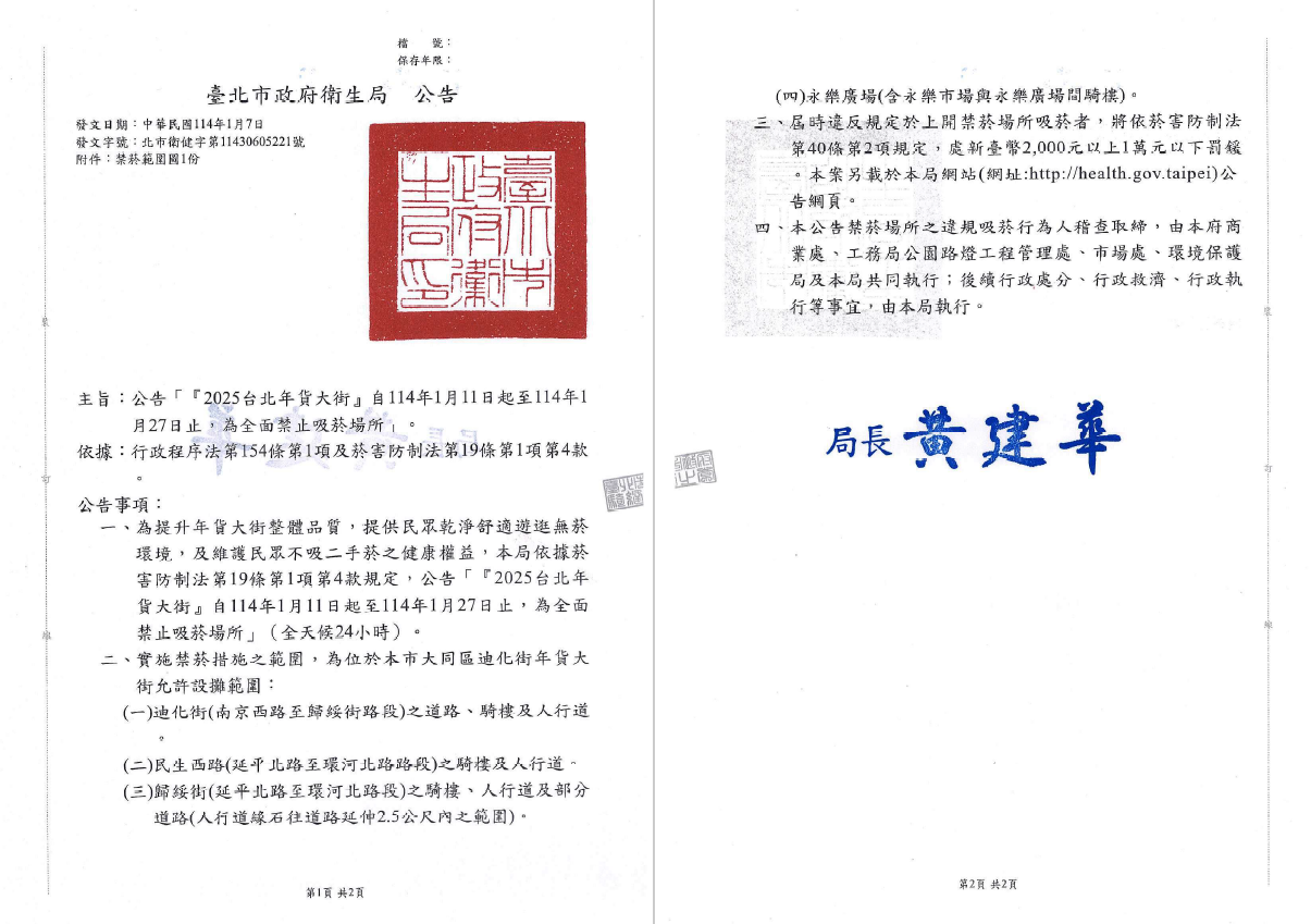 三、實施禁菸措施之範圍,為位於本市大同區迪化街年貨大街