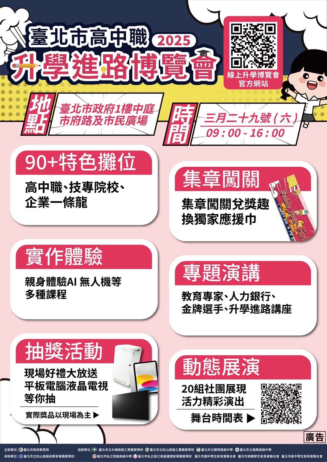 一、依據臺北市2025年高中職升學進路博覽會實施計畫及本局114年3月21日北市教職字第1143047148號函續辦。