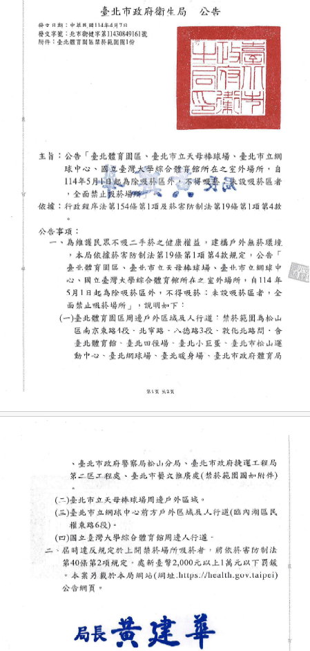 本局依據菸害防制法第19條第1項第4款規定,公告「臺北