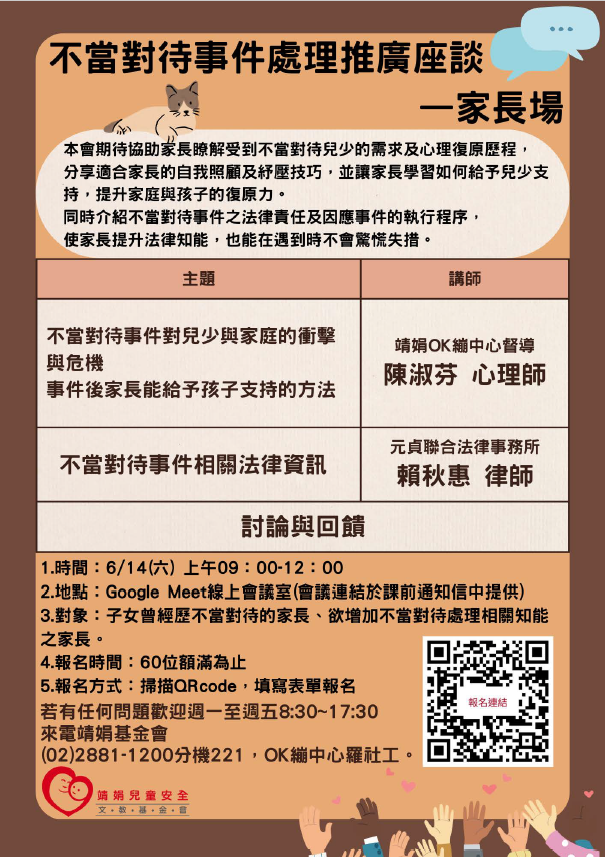 該基金會期待以座談的方式與家長分享受到不當對待兒少