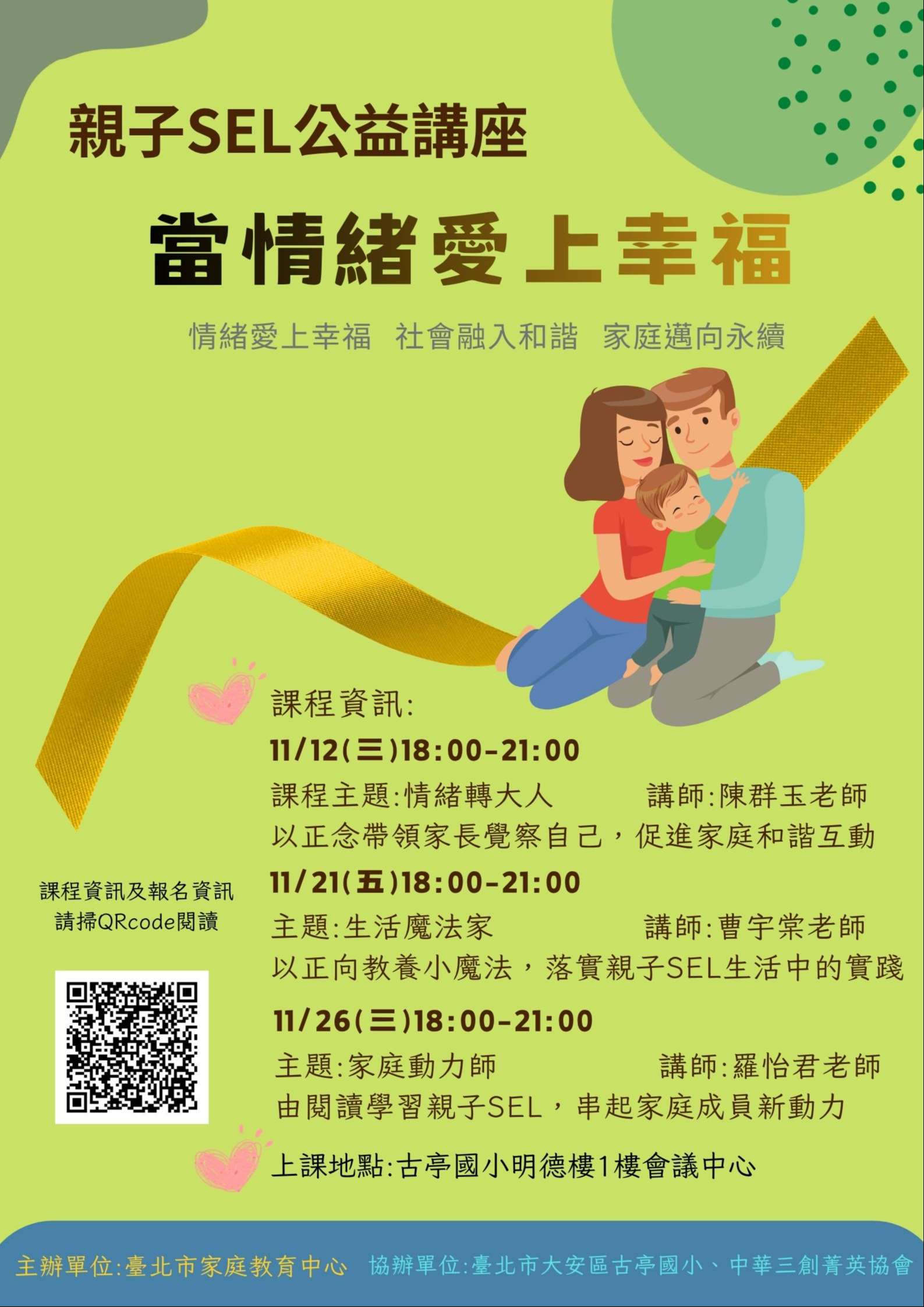 一、臺北市大安區古亭國民小學與中華三創菁英協會辦理親子SEL公益講座三場,活動內容以讓家長對SEL社會情緒學習有更多認識,進而融入家庭親子互動,提升教養功能。