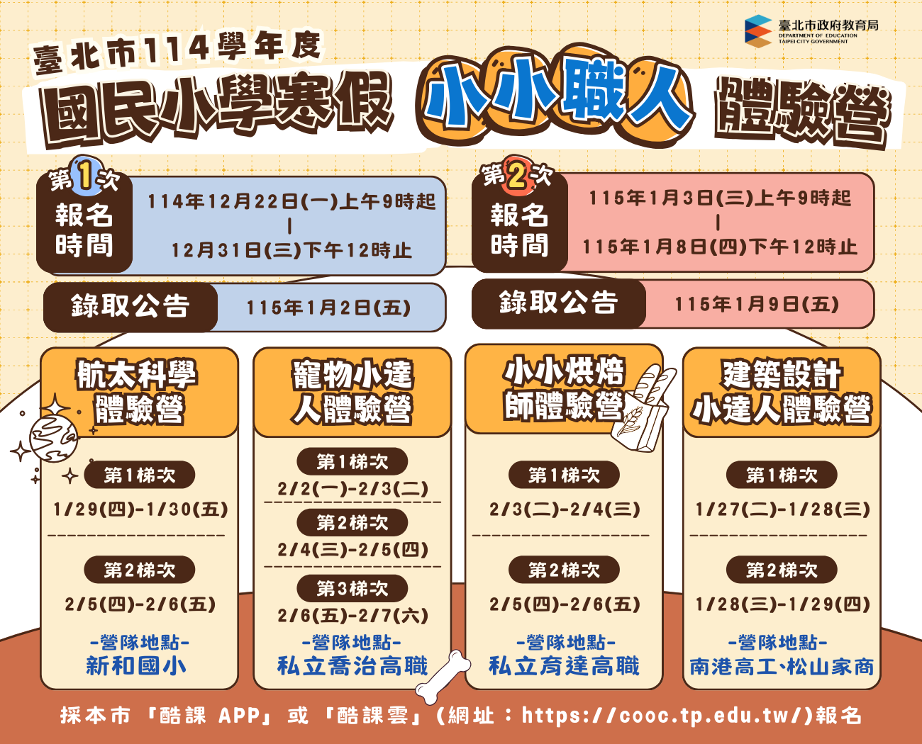 一、依據「臺北市114學年度國民小學寒假小小職人體驗營實施 計畫」辦理。