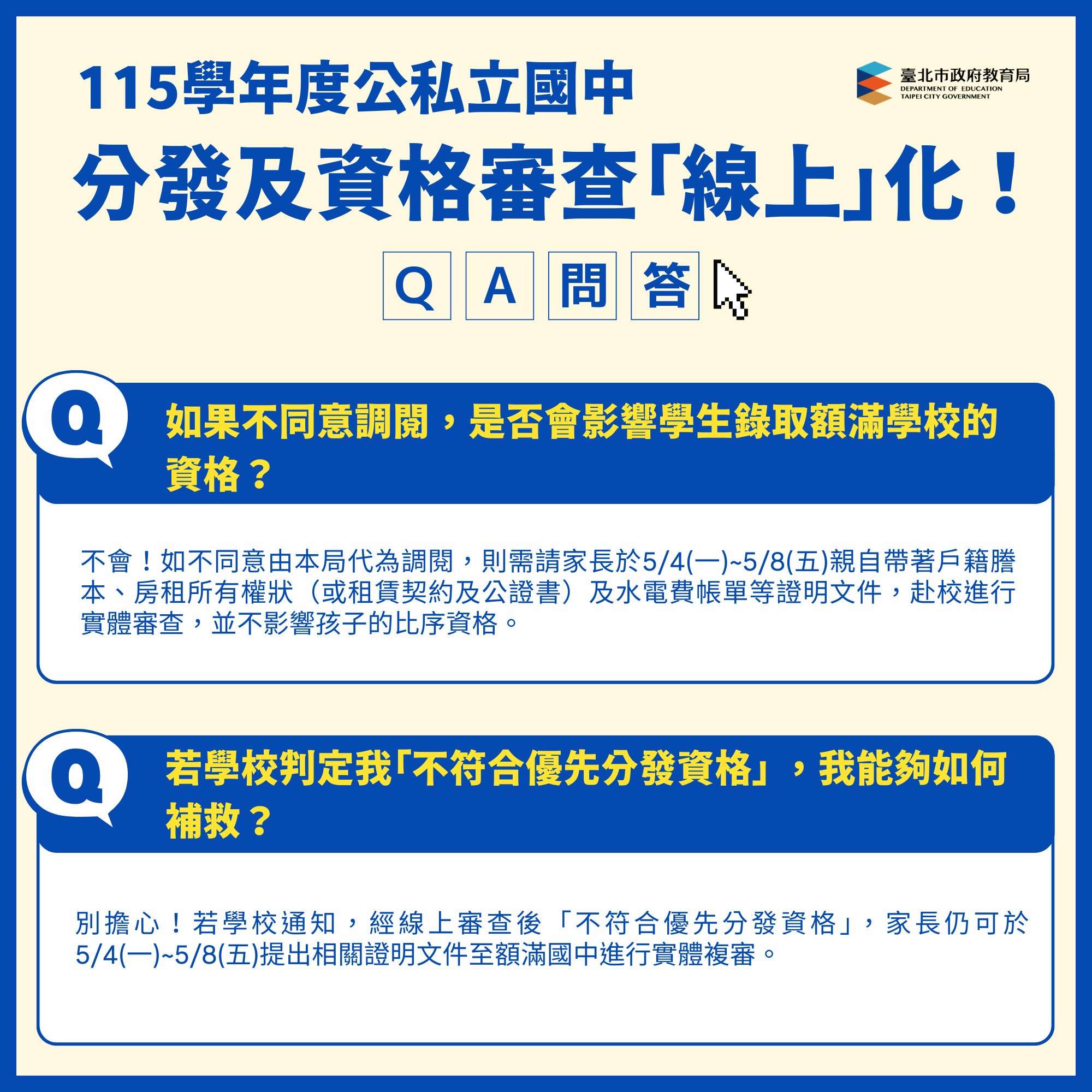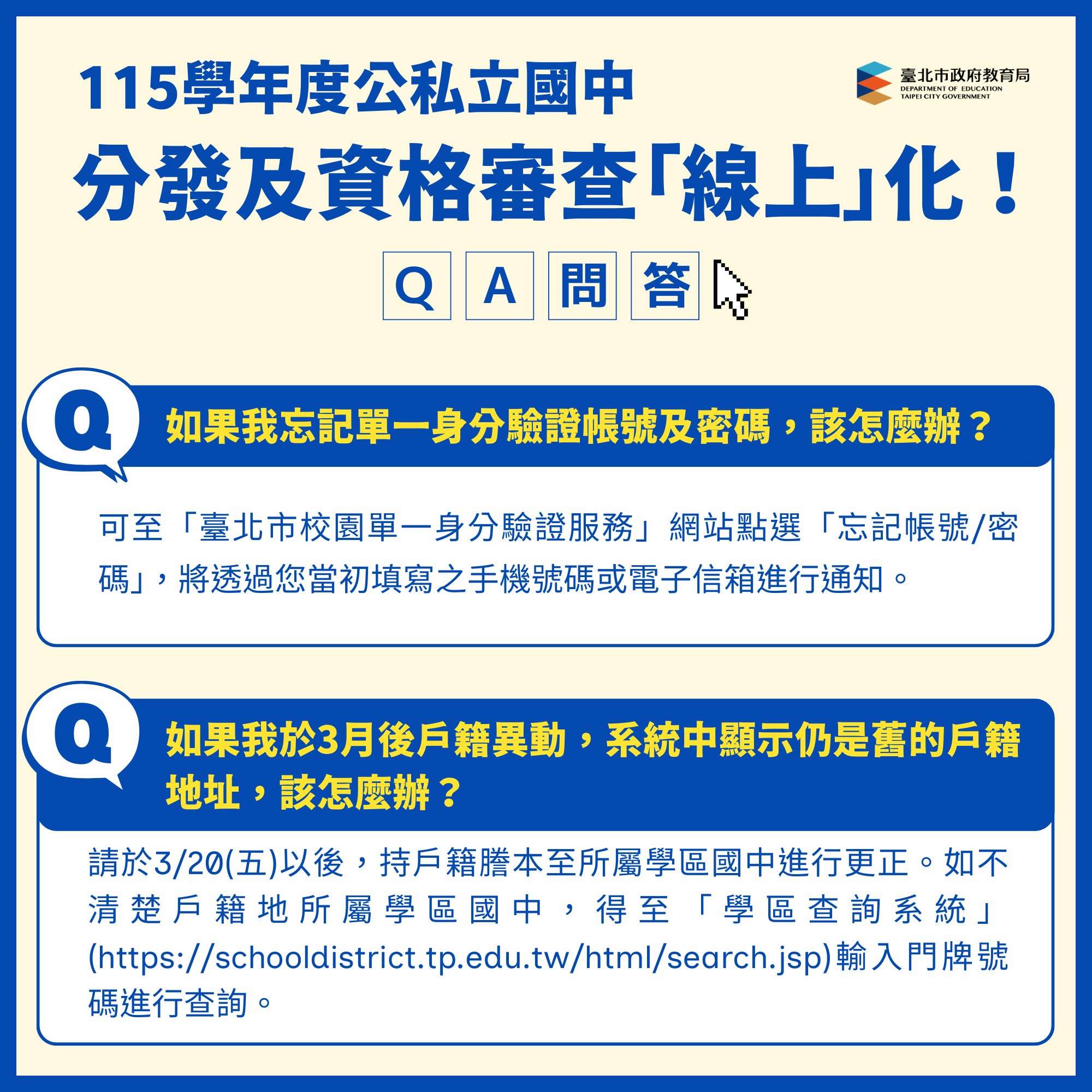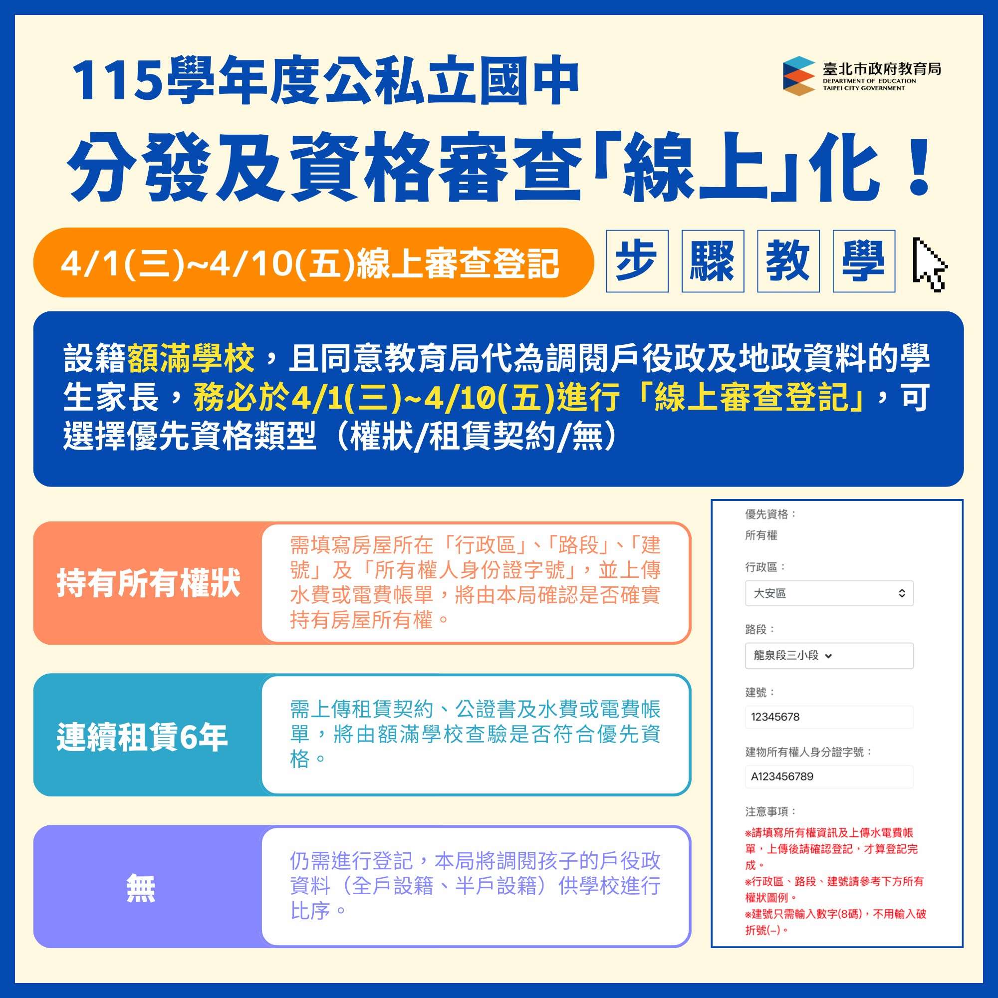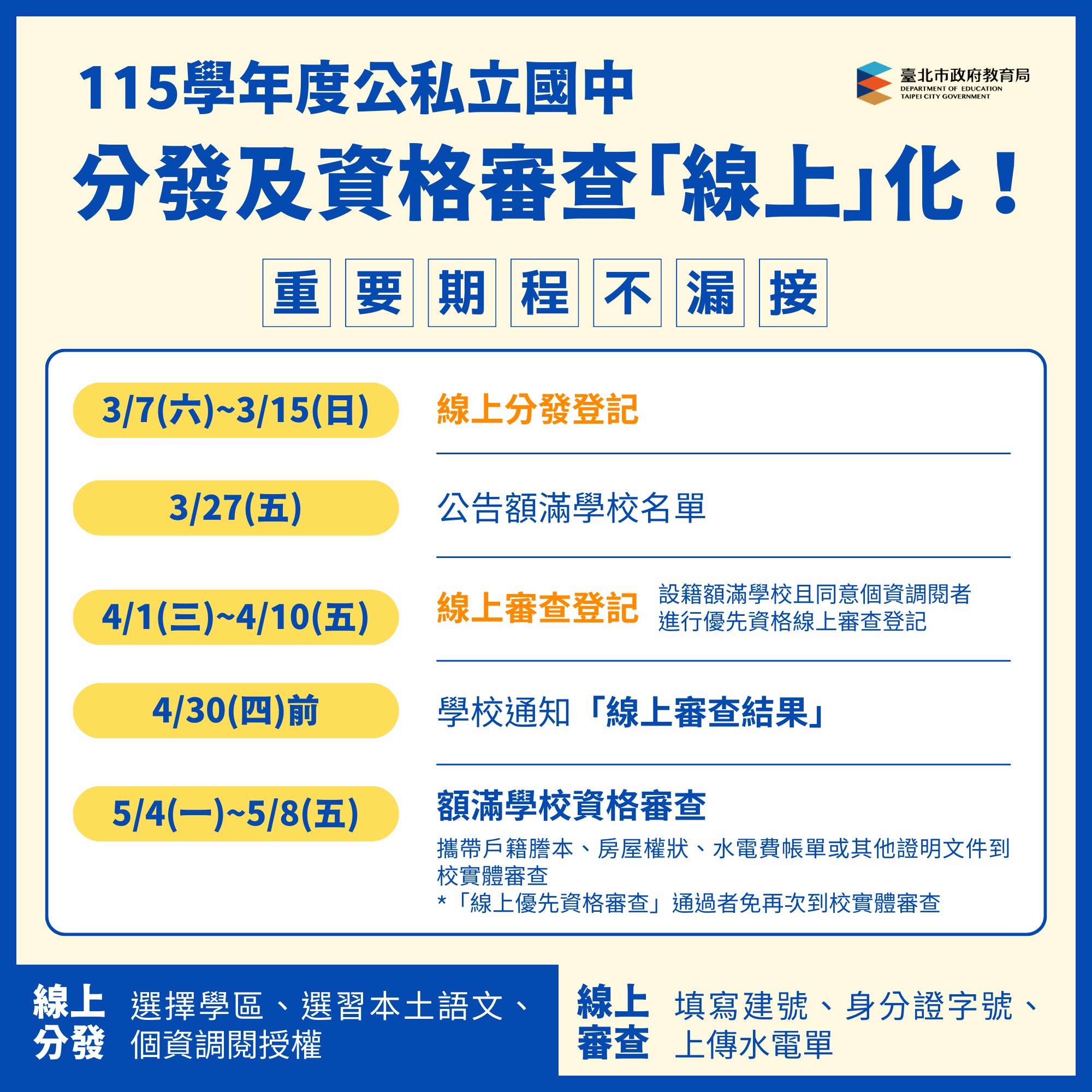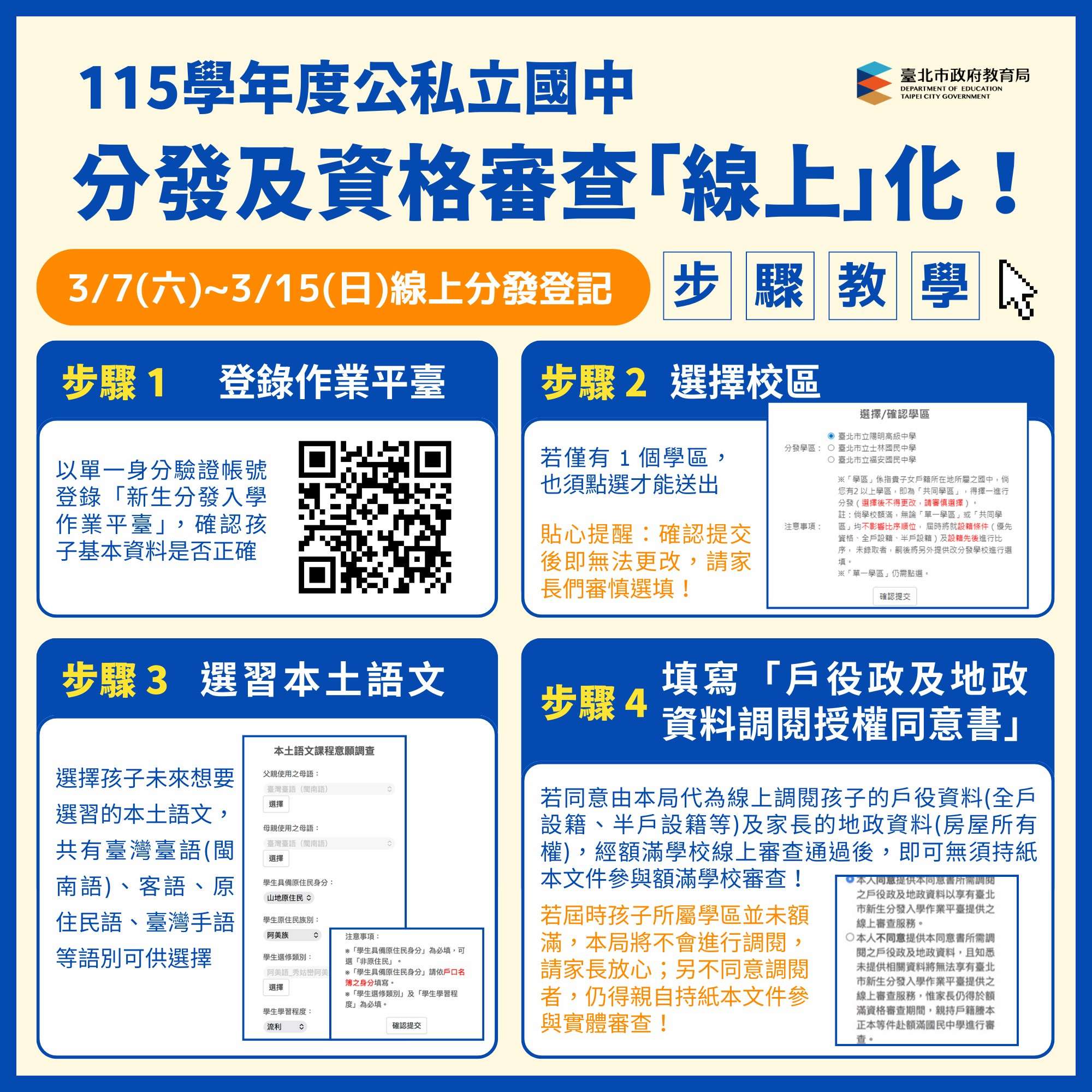 「#115學年度臺北市公立國中分發及資格審查」全面線上化!透過「#新生分發入學作業平臺」,從分發登錄、資格審查到後續報到,皆可採線上方式辦理,在家即可完成重要入學程序,省時又便利![]()